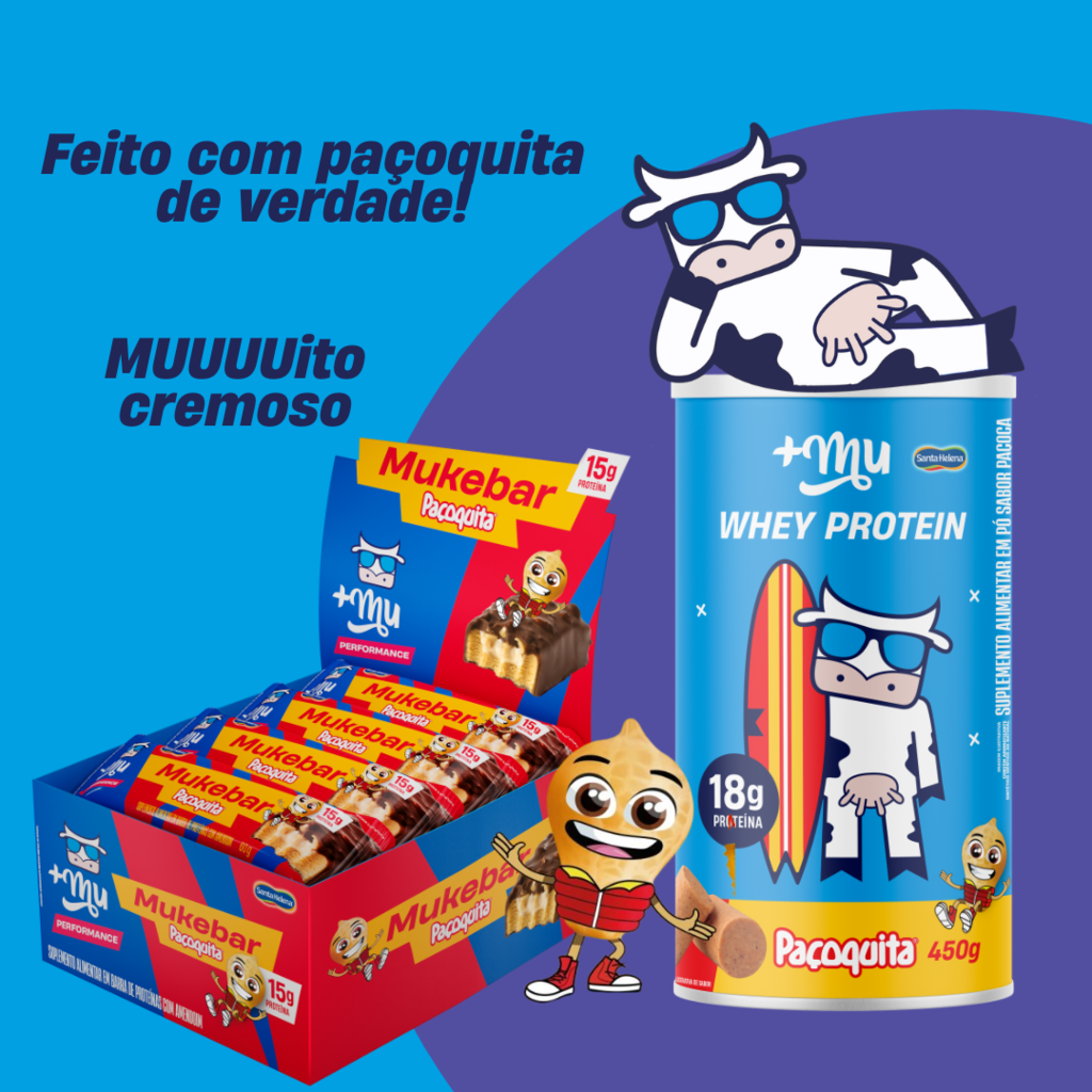 A Mais Mu e a Paçoquita se juntaram para criar a fórmula perfeita entre o que já era gostoso (Mais Mu) e o que era delicioso (Paçoquita). E a fórmula, pra ficar perfeita, precisa de duas coisas: 🐮 proteína 😱 zero adição de açúcar E aí temos Mukebar Paçoquita, nossa barra de proteínas com 15g de proteína e zero adição de açúcar, e o lançamento mais esperado de todos: Whey concentrado sabor Paçoquita, com 18g de proteína concentrada do soro do leite!!